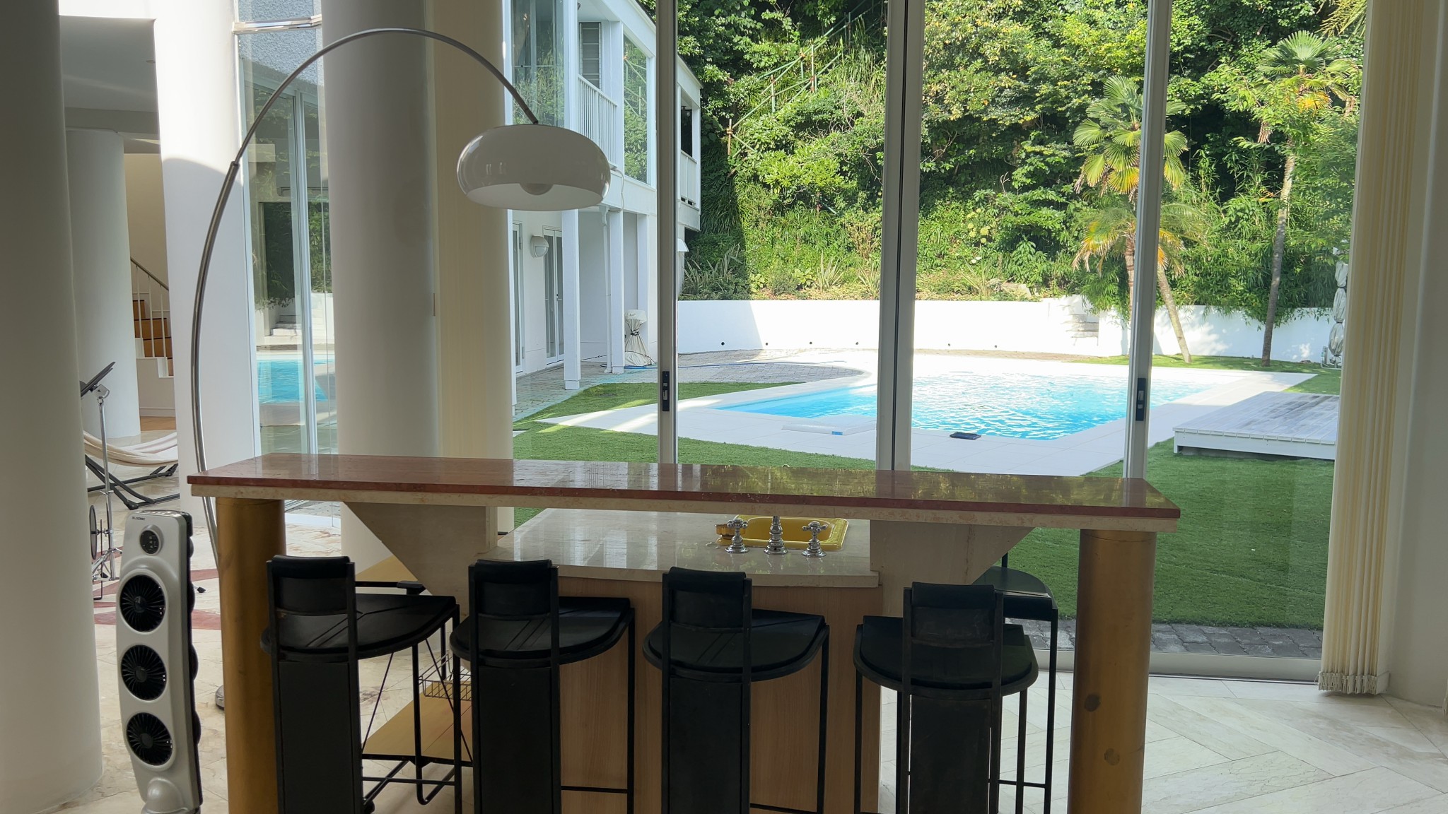 設計によるものでリビングを構成する柱と高い天井が特徴的な空間を作り全ての部屋から中庭のプールを望むことができます。